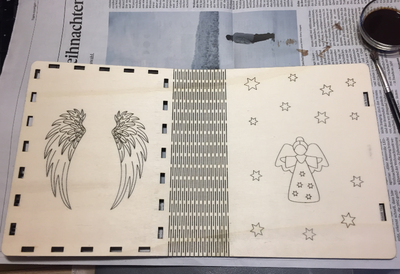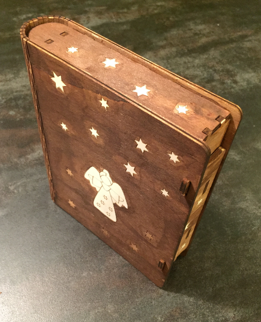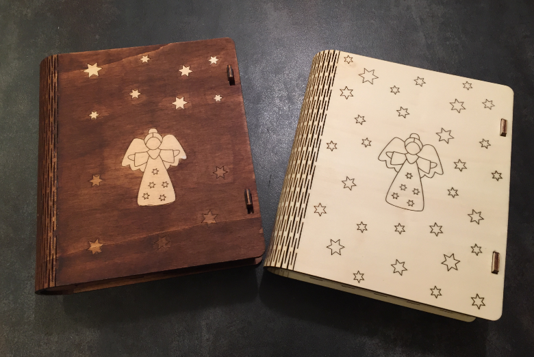 The idea was to put sweets into a ‘book style’ lasercut box, engraved with an angel theme.