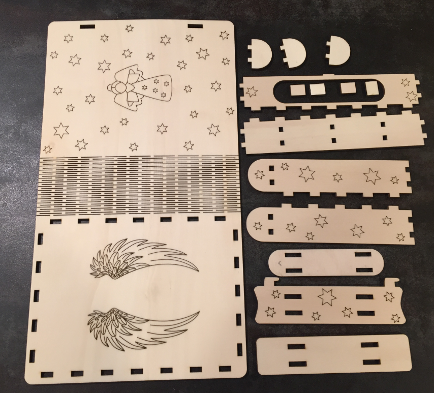I used a 50W Lasercutter with LightBurn to engrave and cut it usint 4 mm Birch Plywood sheets: