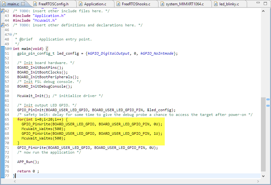 - Now set SW7 back to boot from internal FLASH (SW7: 0010), reset the board, and the programmed application (e.g. blinky) shall run.