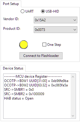 - Next click the ‘Connect to Flashloader’ button, the status shall now be green: