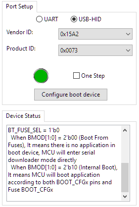 - Start NXP-MCUBootUtility-1.0.0\bin\NXP-MCUBootUtility.exe. Select the device and using USB-HID. It shall list the VID and PID discussed above. If not, check your USB connection.