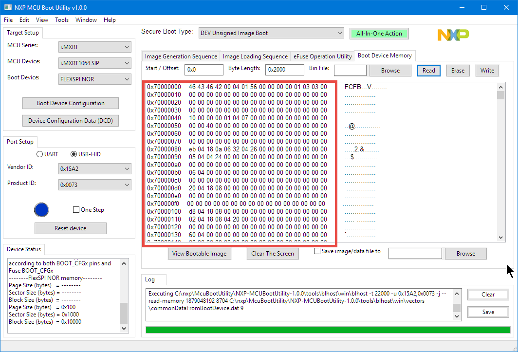 - Press the ‘Configure boot device’ button and the status shall change to blue. Notice the section about the FlexSPI NOR memory configuration in the Device Status. Only with such settings the tool is able to operate properly with the internal FLASH and will use an offset of 0x0 (otherwise you have to specify an offset or address of 0x70000000):