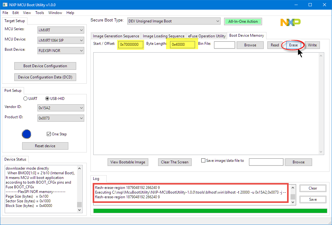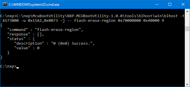 C:\nxp\McuBootUtility\NXP-MCUBootUtility-1.0.0\tools\blhost\win\blhost -t 6573000 -u 0x15A2,0x0073 -j -- flash-erase-region 0x70000000 0x40000 9