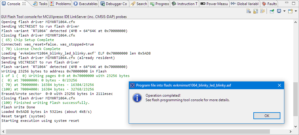 - Now program a ‘known-good’ application (e.g. a blinky) to the MCU using the MCUXpresso GUI Flash programmer: