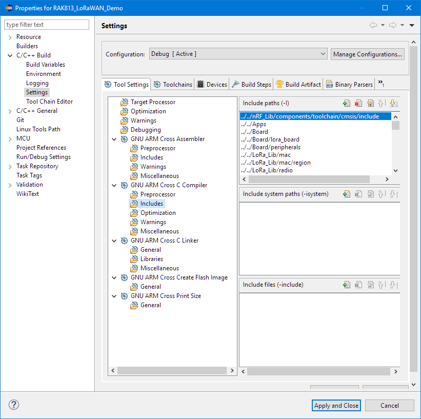 Add the Apps, Board, LoRa_Lib and nRF_Lib folders as linked folders to the project. Add startup code and System files: