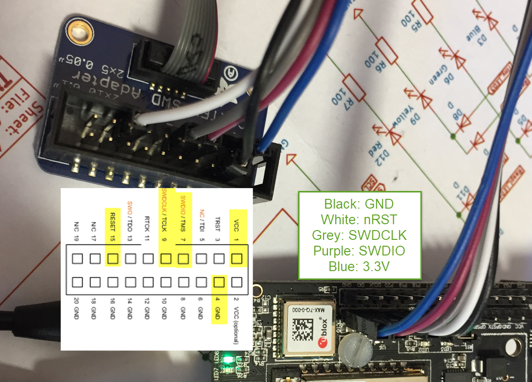 The board does not have a standard debug header :-(, so I have to build an adapter: