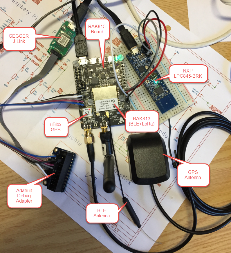 The picture below shows my setup. The RAK815 includes a nRF52832 (ARM Cortex M4F with 512KByte FLASH and 64 KByte RAM). I’m using it in combination with the NXP LPC845-BRK board: