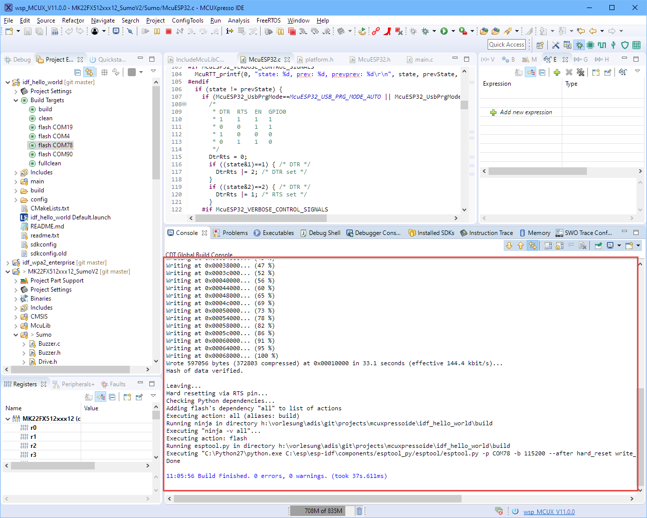 I’m able to use the NXP Kinetis K22 as gateway to the ESP32 module: I can program it and I can use it for a serial/UART/terminal connection. Things have not been optimized yet, so there is currently a limit of 115200 baud as programming speed. Because the idf.py is compressing the image, programming speed is around 150 kBits/s.