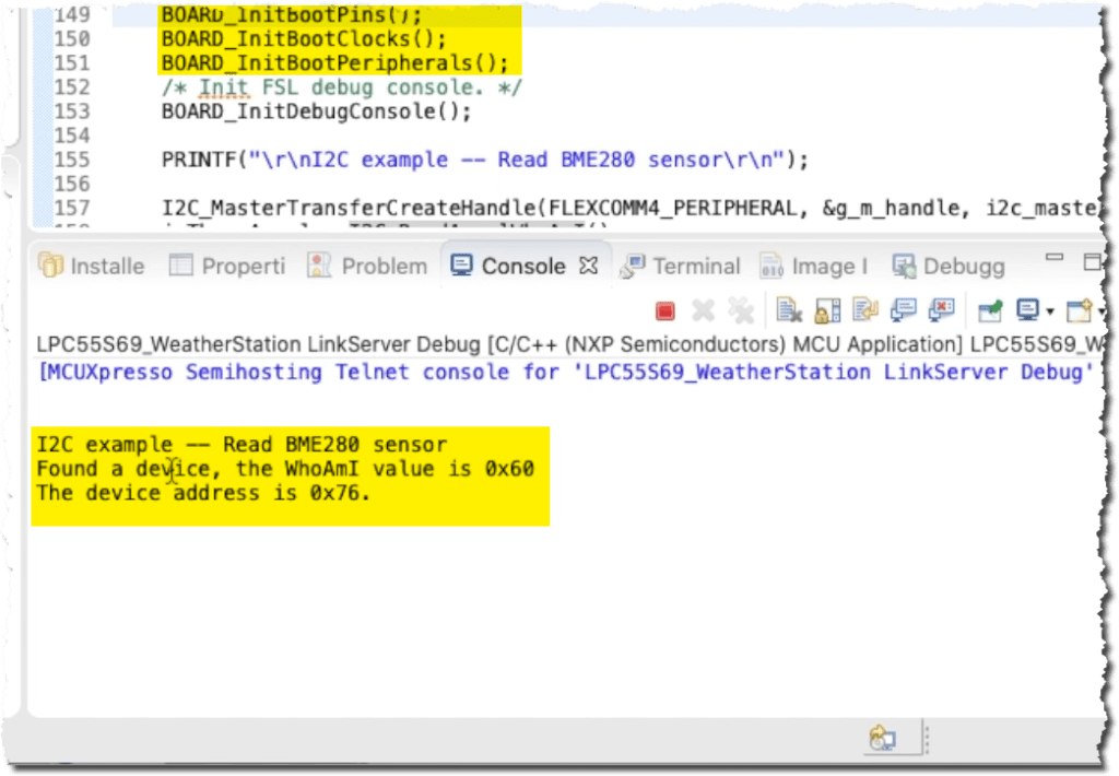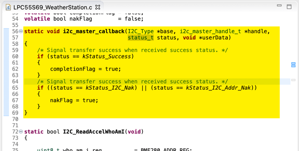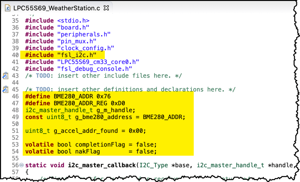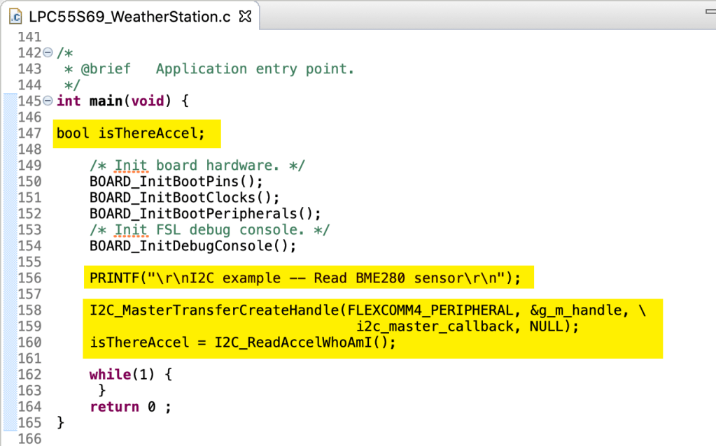 We do (of course) need to write some software to make the Bosch BME280 sensor come alive. You can refer to my YouTube video for this tutorial to see the software in action, but here is a quick summary of the changes, and the file is here. All edits are in the “C” source module named LPC55S69-WeatherStation.c that the new project wizard created: