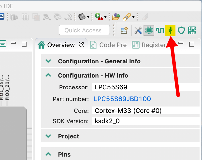 Well, that completes the clock configuration. We can use the icons in the top right of the Clocks Config perspective to switch to the Pins view: