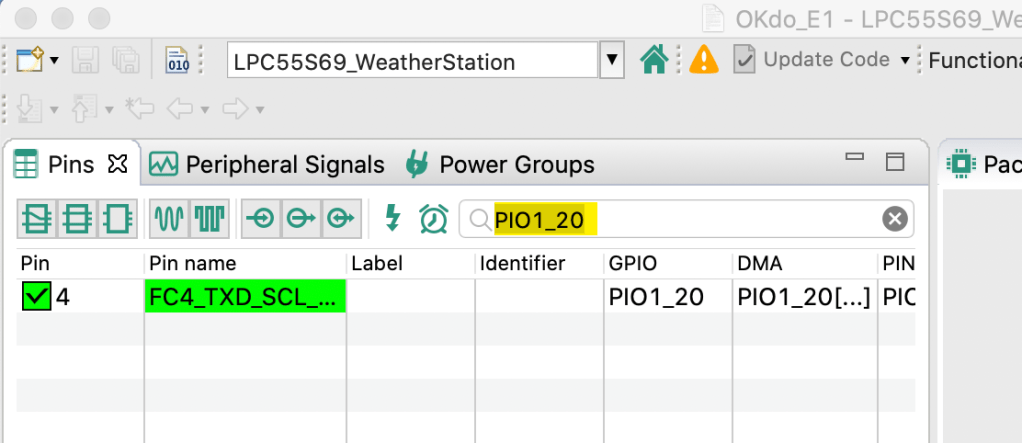 Recall that the I2C signals are on pads PIO1_20 and PIO1_21. In my tutorials, I’ll always use the word PAD to mean one of the ports (with a name like PIO1_20 in this case). Depending upon the package (BGA, QFN, LQFP…) that pad will be routed to a pin. On the OKdo E1 board the package is LQFP100, and pad PIO1-21 is routed to pin 4. Pin 4 has many possible multiplexed functions. We use the Pins Config tool to select which of these pad functions is brought out to the pin.