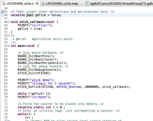 In this code snippet, I #include the driver fsl_utick.h (line 43), then I initialise (line 63) and configure the UTICK0 to give me a onetime interrupt after 2,000,000 microseconds that will call the registered utick_callback function (line 67). Lastly, the callback function is declared at line 48.