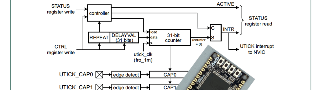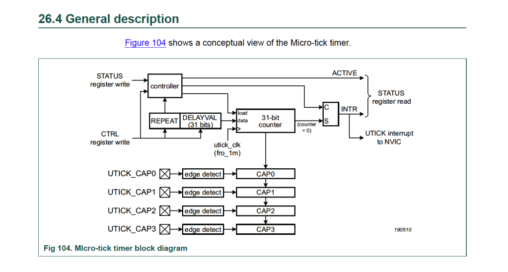 It’s a very simple timer! A dedicated 1MHz free-running oscillator fro_1m is the clock source, and the timer can be loaded with a 31-bit count value. The clock decrements the timer, and at Count = 0, an interrupt is asserted to the NVIC. There is a repeat mode, so that the timer generates a periodic interrupt, but I prefer to use the timer in “Onetime” mode… I simply configure the timer to generate an interrupt in ‘X’ microseconds, and the UTICK driver sends my code into the callback function that I assigned to the driver.