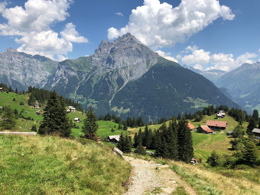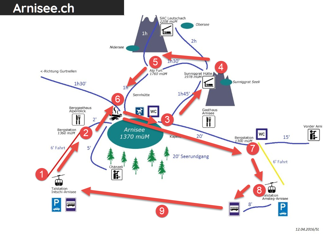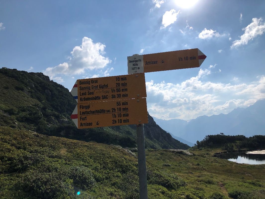 Start at Intschi, then with the cable car up to the Arni lake. Pass the lake it and take the path through the forest up to the Sunniggrat (2033 m), then traverse to the Alp Furt, back to the Arni lake and then take the gondola down to Amsteg, take the bus back to Intschi.