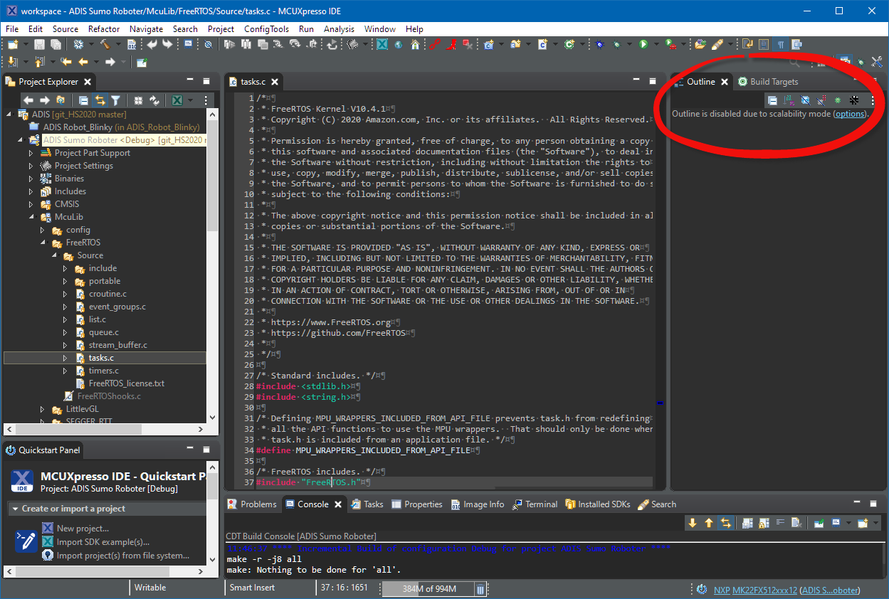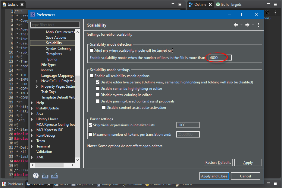 This does not only apply for FreeRTOS tasks.c, but for any huge files going beyond the 5000 lines scalability setting: such huge files are not a problem for Eclipse (I have seen software stacks with >10k lines of code in a single file!), it is only that the 5K setting kicks in. But now you know as for everything in Eclipse: there is a setting for it. A good indication to check if the Indexer is working is using the Outline View.