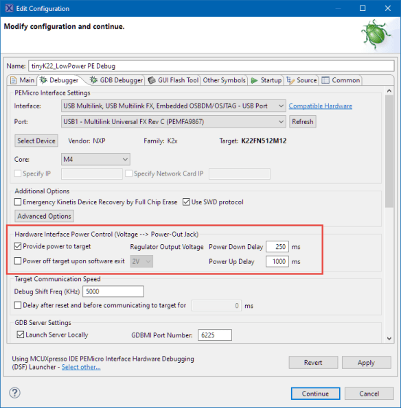 Implementing low power in embedded applications implemented can be challenging. Measuring current consumption is a first step to see if the software changes indeed have an effect on the current consumed. The PEmicro Universal Multilink FX debug probe comes with a useful feature to provide power to the target and the same time to measure the current consumption and to show the current used in the Eclipse IDE: