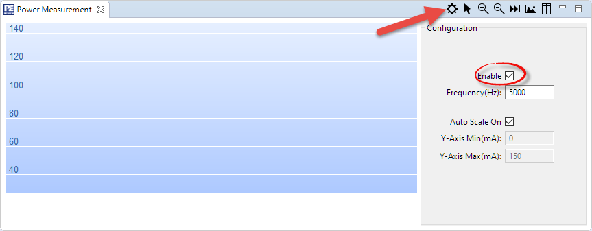 In PEmicro Power Measurement view, I can enable power measurement using the gear icon: