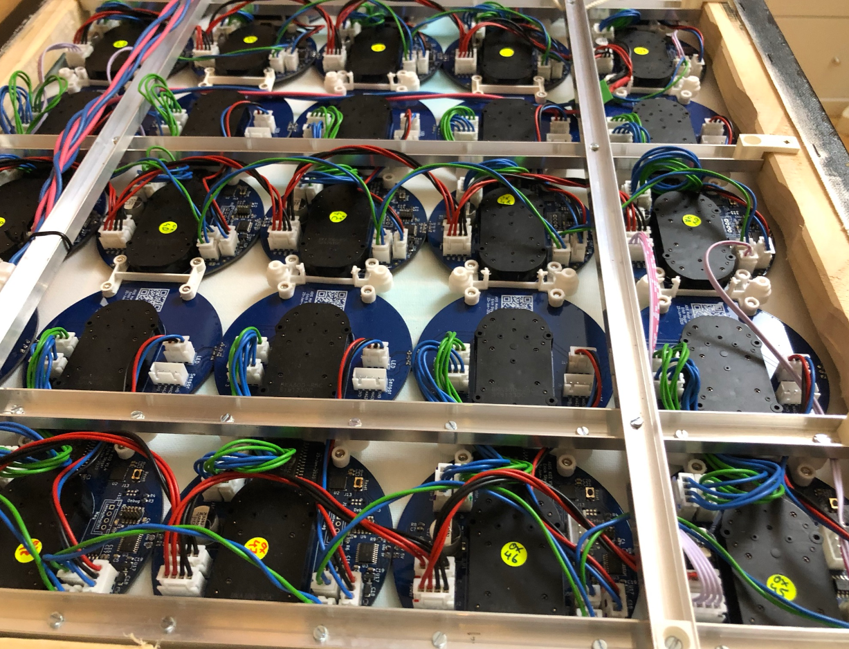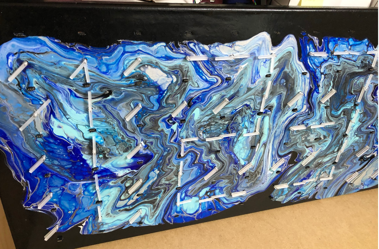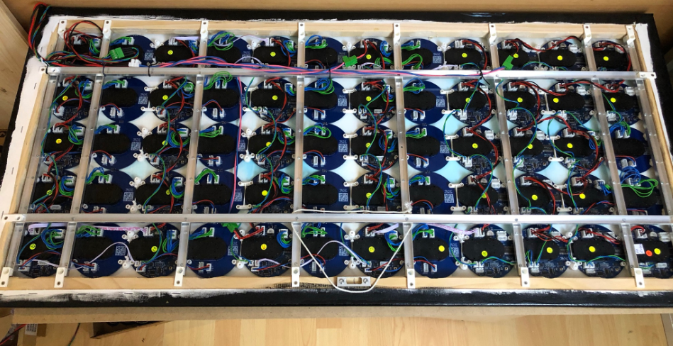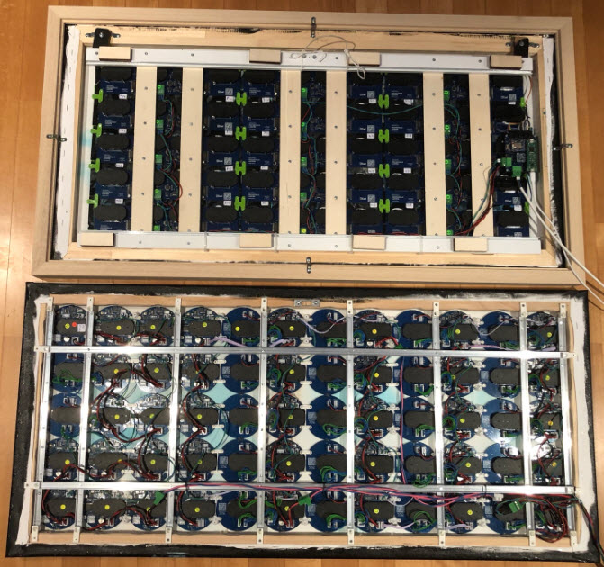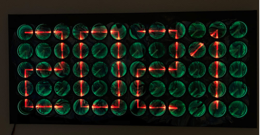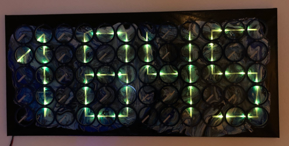 This clock is the successor of the previous version (“60 Billion Lights”: 2400 RGB LEDs and 120 Stepper Motors hiding behind Canvas Art). It is possible to arrange the clocks in any way with any kind of framing material. I have decided to use a canvas so I can hang it on the wall as a ‘piece of art’. Of course ‘art’ can be very subjective, so you could use whatever you like.