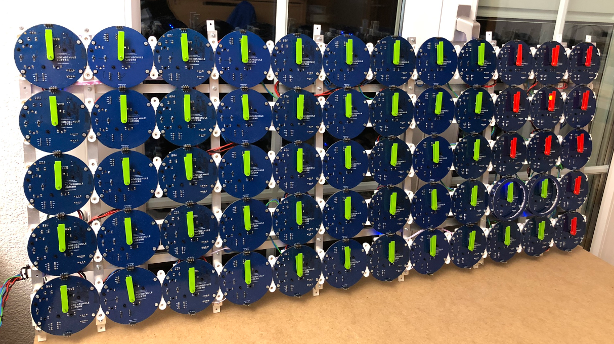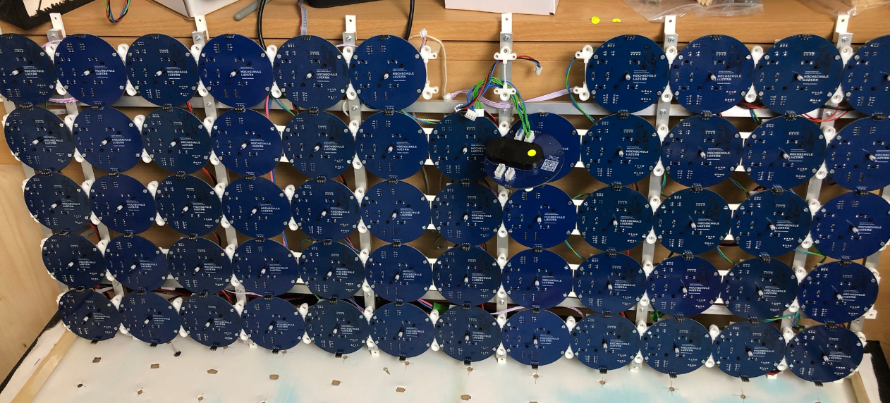 The hands are moved by stepper motors and followed by the LEDs. The 120 stepper motors (one dual-shaft motor for each clock) is controlled by a microcontroller to create choreographs or to write any text or numbers.