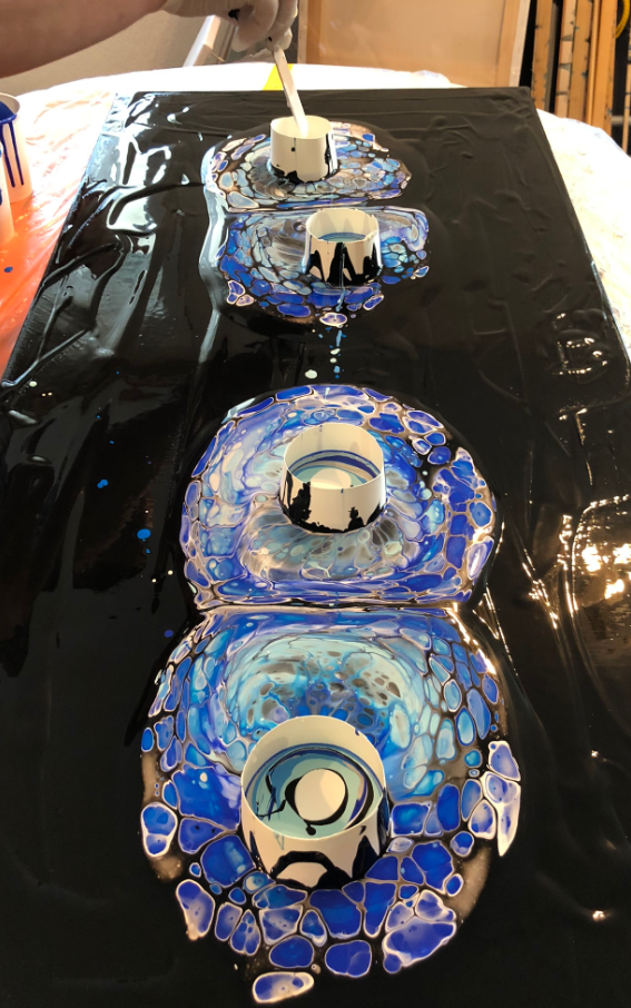 The canvas gets ‘flooded’ with black color and cups placed on it: