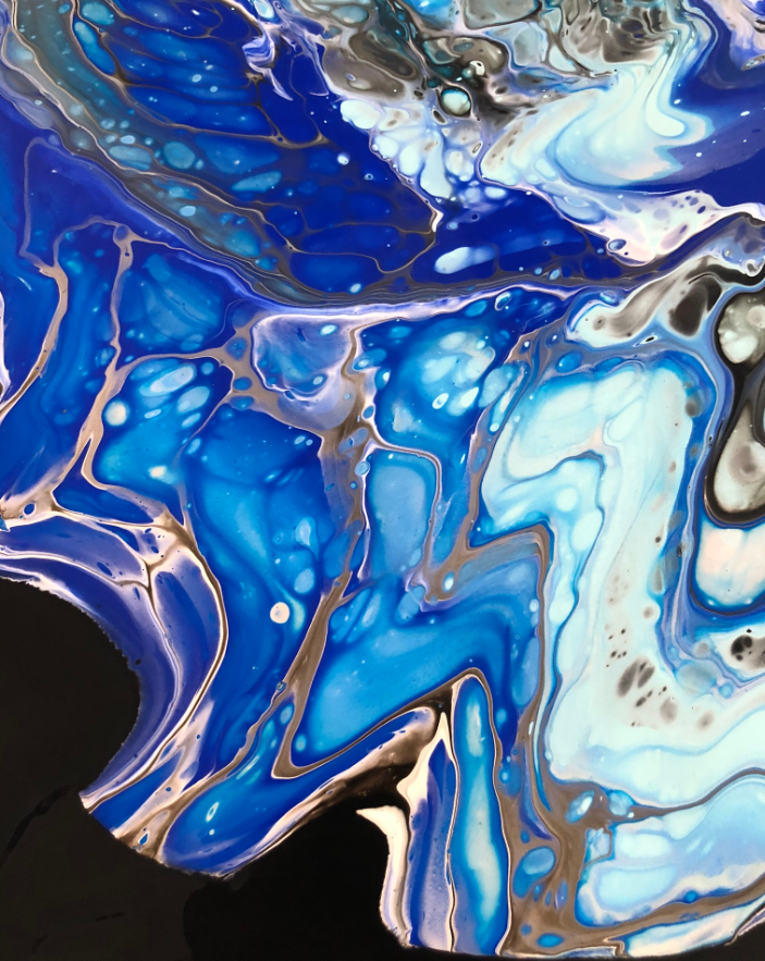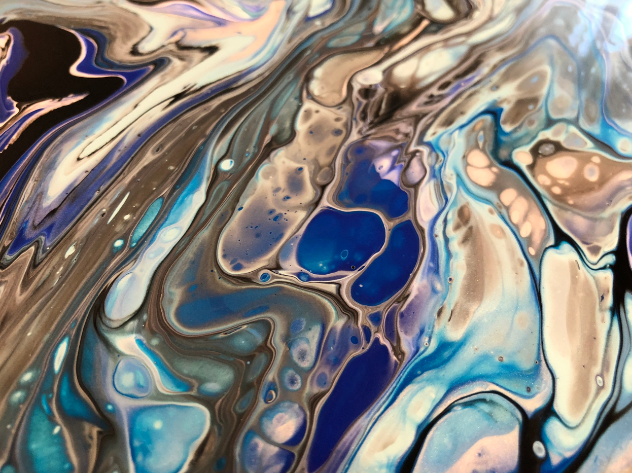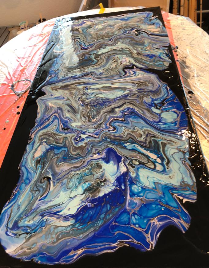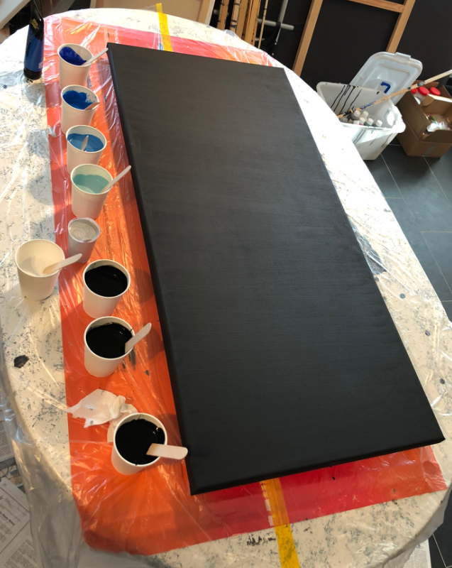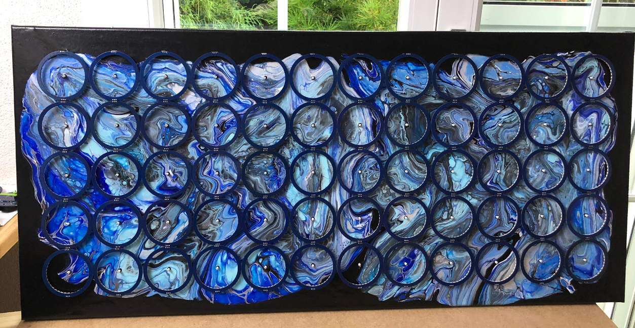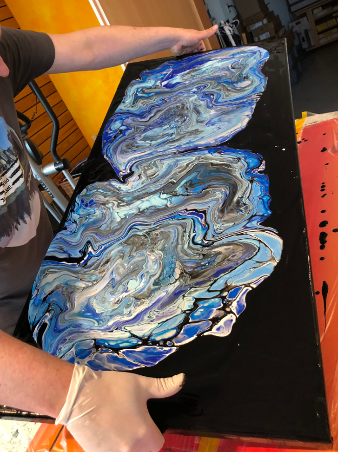 As for the previous version, I used acrylic pouring on canvas to create the background of the clock. Below pictures of the process. The painting is on a black background:
