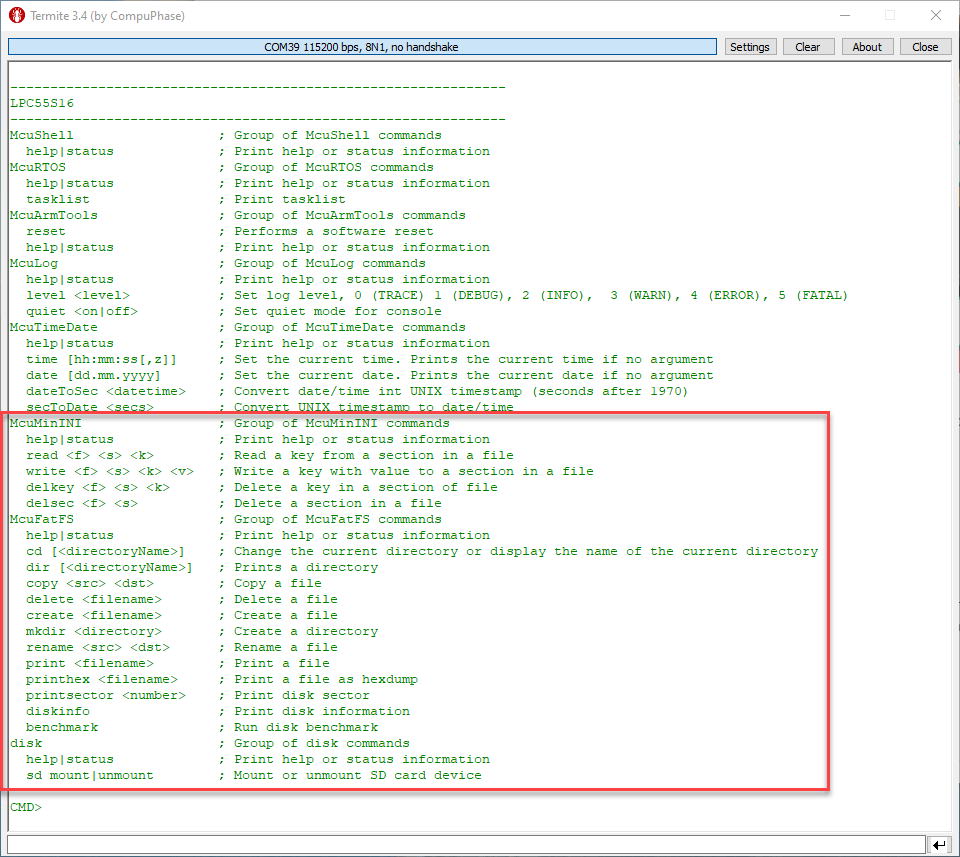 Unfortunately there are no SD Card examples in the SDK for the LPC55S16. Using the McuLib and the other drivers from the SDK I was able to get support for any SD card breakout or micro-SD breakout board: with the project above it only requires a few #defines to set up. That way I have FatFS including MinINI including command line interface running on the LPC55S16 board. I hope you find this useful and can use this potentially for your own project. All the files are open source and available on GitHub (see links below).
