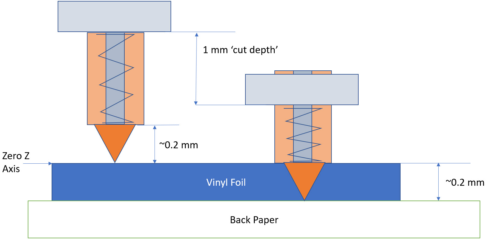 Usual vinyl foils are around 0.2 mm thick. The blade shall only cut the foil and not the back paper, so the blade is only 0.2 mm outside of the head. Zero Z axis is the top of the vinyl. Telling the machine to have a cut depth of 1 mm means it will press the head down 1 mm from the Z zero position: with the spring loaded blade the knife will only go 0.2 mm deep inside the vinyl, and the head will be pressed with the spring onto the vinyl surface.