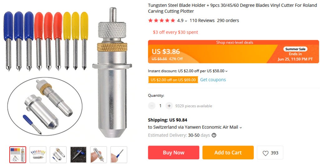 - 1x Roland cutter blade holder with cutting blades (around $5)