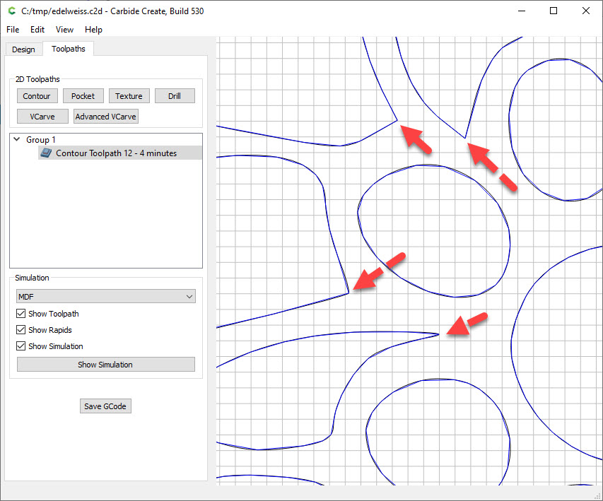 To cut out the designs I generated GCode for the machine using the free version of Carbide Create and the open source tool Inkscape. One important aspect for the design is to avoid ‘sharp’ corners if possible. Below is a detail of the design I used:
