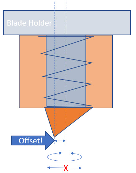 The advantage of drag knifes for vinyl cutting is that the blade can rotate freely and the head does not need to turn. To make this work, the knife has an offset to the center of the drag knife blade holder: