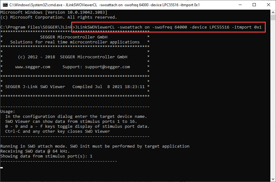 JLinkSWOViewerCL -swoattach on -swofreq 64000 -device LPC55S16 -itmport 0x1