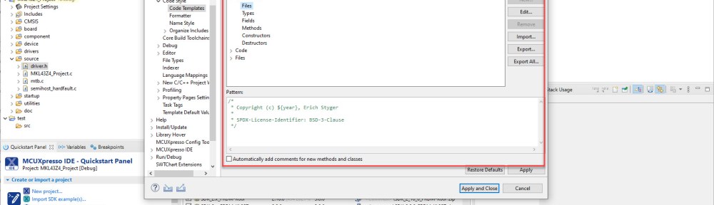 On that dialog (https://mcuoneclipse.files.wordpress.com/2021/10/code-template-for-new-files.jpg) there are export and import buttons. I export them and put them on version control system for the team, and everyone imports that exported XML file, so we all can have the same settings.