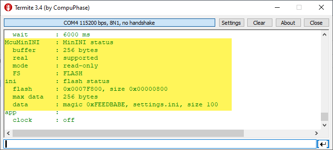 With this additional glue port for minINI it is possible to use it without a file system. This makes it suitable for smaller embedded systems. It supports a read-only and read-write data storage. It uses direct flash memory read/writes and only in read-write configuration it needs a configurable RAM buffer for writing or extending the data. With this it is easy to add ‘key-value’ pair storage to any embedded system, with the cost of less than 10 KByte of FLASH memory.