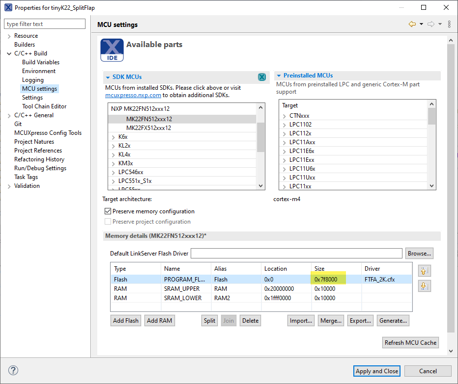 For storing the data in FLASH, it needs at least one sector or flash page. The size of this depends on the system used and is for example 1 kByte (LPC845) or 2 KByte (Kinetis K22), depending on the microcontroller. The size is configured with McuMinINI_CONFIG_FLASH_NVM_BLOCK_SIZE.
