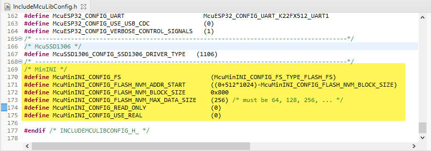 For storing the data in FLASH, it needs at least one sector or flash page. The size of this depends on the system used and is for example 1 kByte (LPC845) or 2 KByte (Kinetis K22), depending on the microcontroller. The size is configured with McuMinINI_CONFIG_FLASH_NVM_BLOCK_SIZE.