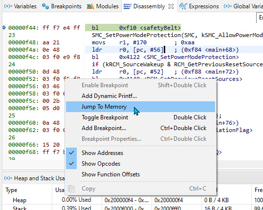 Another nice feature is the new context menu ‘Jump to Memory’ inside the disassembly view which makes debugging PIC code easier:
