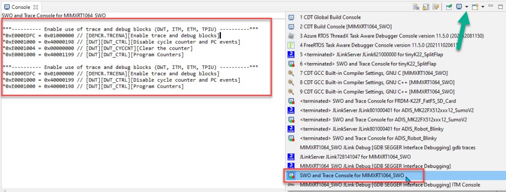 Another great and related features is now that the modifications by the IDE/debugger are written to the SWO and Trace Console: that way I could copy&paste that code and analyze what the debugger does and potentially use the same code in the application without the need for the debugger.