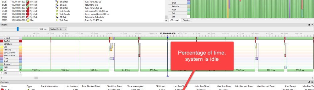 - Idle Time is the percentage the FreeRTOS application is idle (the application is just refreshing the OLED display): the higher the number, the better.