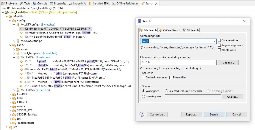 Obviously, this might get a lot of hits. The above search is not case sensitive, so it shows all kind of similar usage of printf() you might look into.
