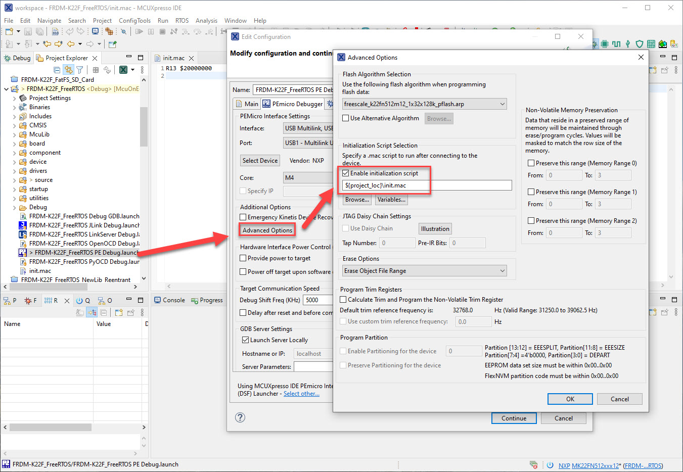 Then use that script file in the launch configuration. There is a setting under ‘Advanced Options’ in the PEMICRO debugger settings where I can specify a script: