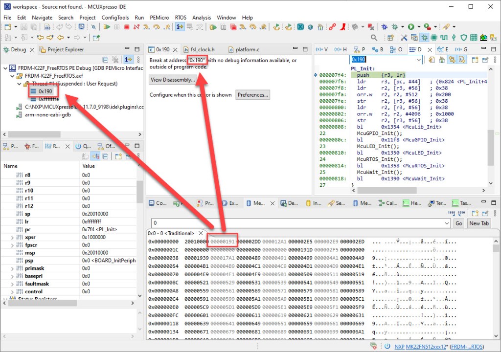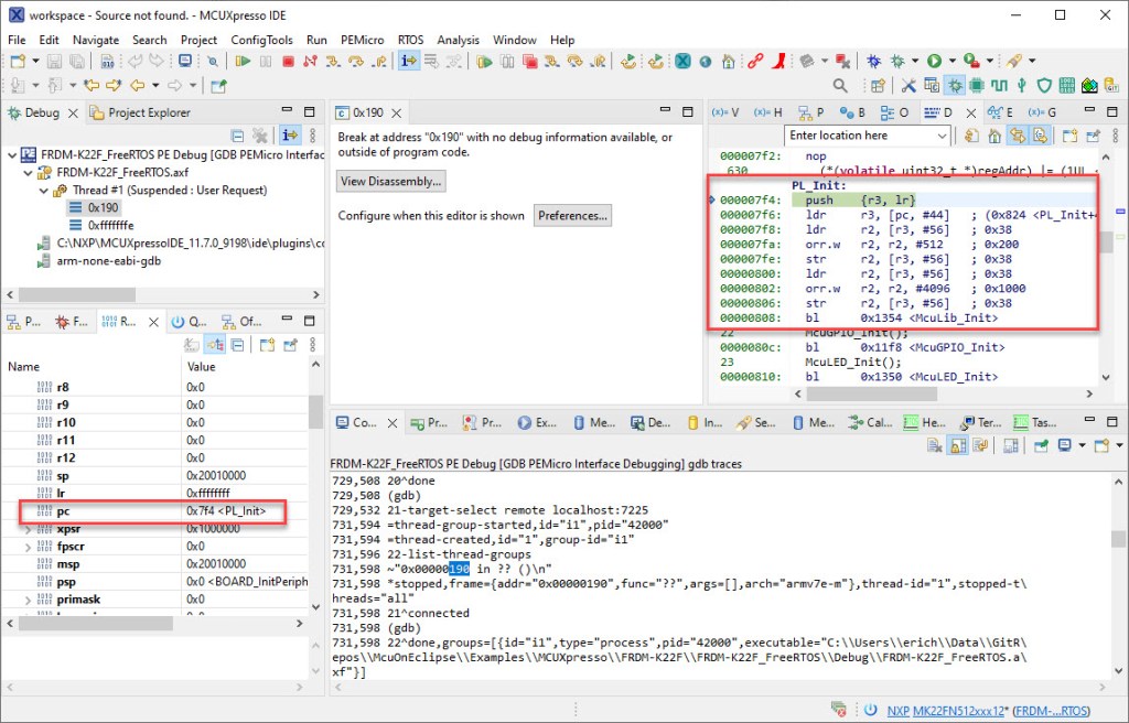You might notice that the debugger tries to show the source for the address 0x190. As seen from the gdb traces, this is because the debugger tries to list the initial thread list. So what happened is that the debugger first fetched the values from the vector table, and then changed the PC. This can be verified with looking at the vector table which contains 0x190 (plus the thumb bit) as initial PC:
