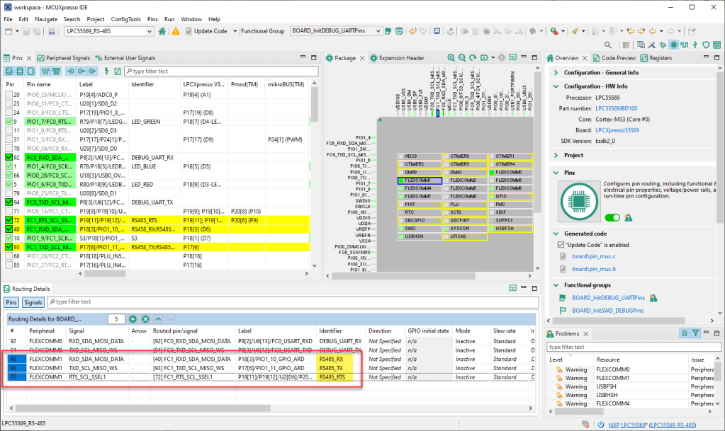 On the LPC side I’m using the UART with FLEXCOMM1, below is the muxing for the Rx, Tx and RTS lines: