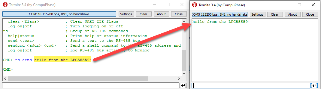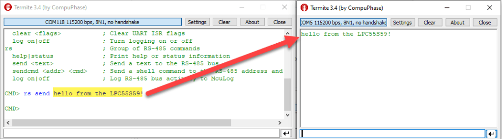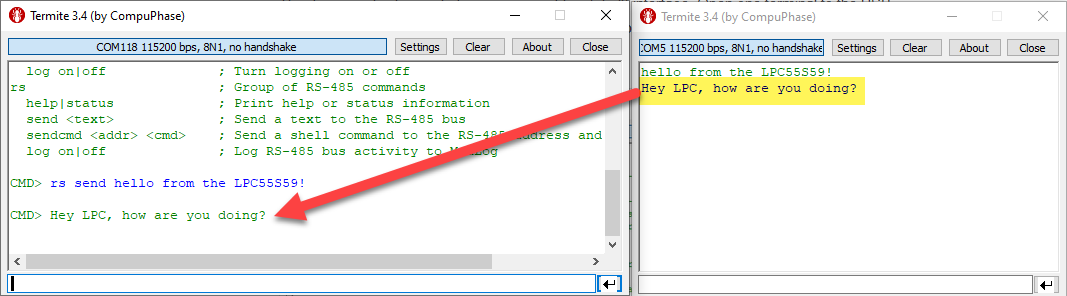 To send text from the LPC55S69, use the ‘rs send’ command, and it should show up on the other (Sparkfun) side: