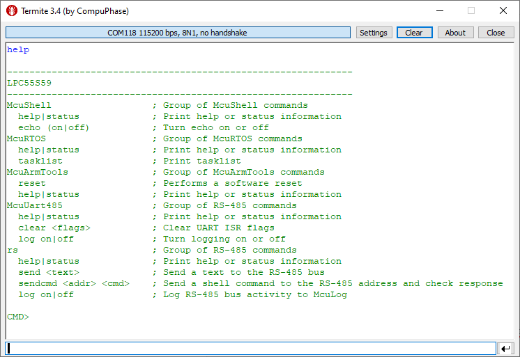 I just have covered sending simple text over the bus, but of course there are more features available. For example with ‘rs sendcmd’ you can send commands to an address on the bus and execute them on the remote node, or one can use the Modbus protocol, see the Modbus folder inside the McuLib. Be free to check the source code and the comments in it to explore more features like this.