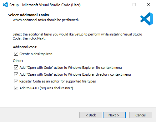 Adding VS Code to the path allows me to start it from a command line shell, which is useful for automation.