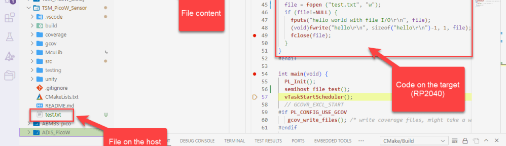 Now everything is in place, I can build and debug my application (do not forget to enable the debug probe semihosting, see Semihosting with VS Code on RP2040), and I can enjoy file semihosting with the RP2040:
