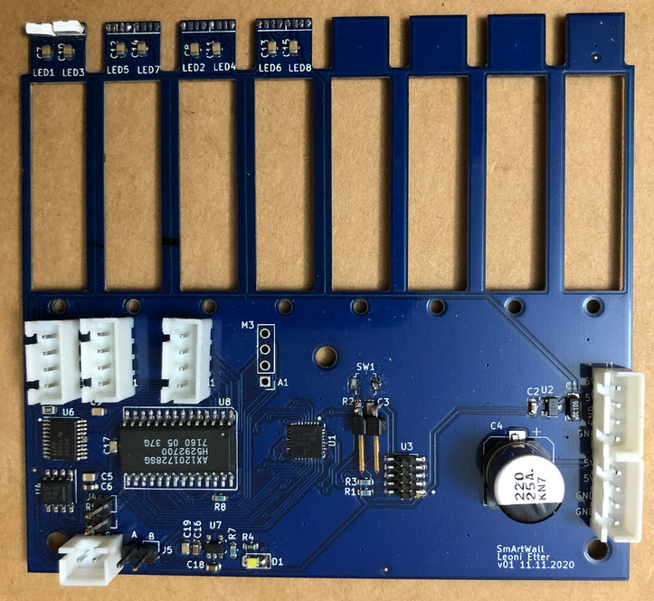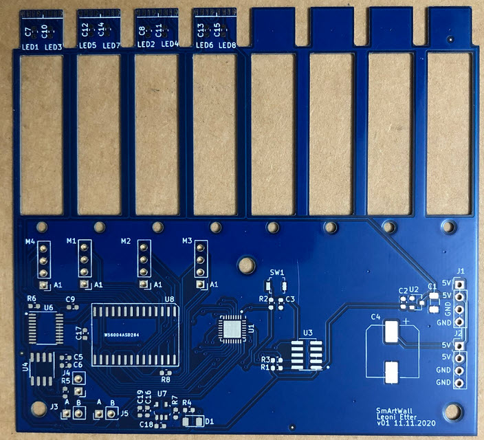 The idea is to create a ‘wall of smart pixels’, with gave the starting project the name ‘SmArtWall’. Leoni Etter explored that idea and created the first working concept.
