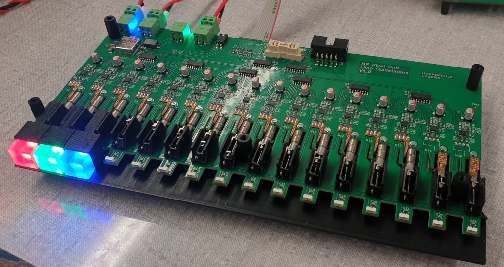 In summary: The concept works, and pixels can be moved. But the used motor driver was not powerful enough to move the pixels in a reliable way, so the stepper motor driver needs to be changed. Additionally the motor connection with the cables was very painful and needed a lot of assembly time. Additionally the space between the boards need to be optimized.