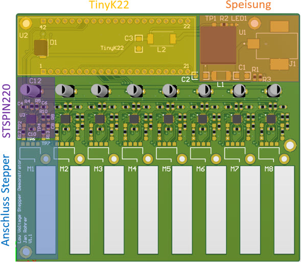 That concept worked :-). After that, a new PCB with a total of 8 motors was built: