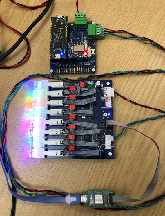 Similar to the MetaClockClock project, the board can be controlled over RS-485. Below a tinyK22 is controlling the pixel position plus the color: